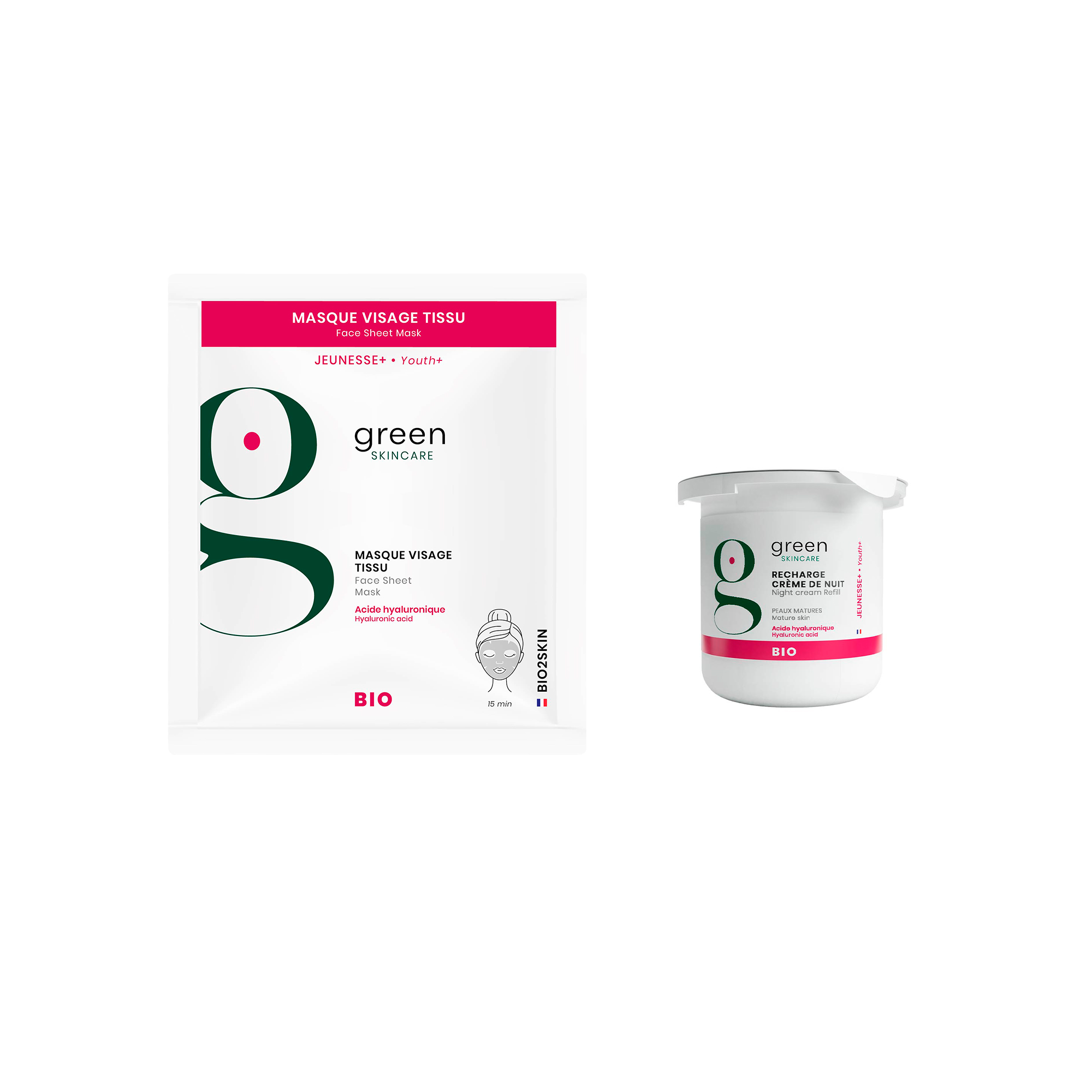 YOUTH+ Ночной крем против морщин с гиалуроновой кислотой (сменный блок): в составе крема содержится гиалуроновая кислота и другие активные компоненты, способствующие борьбе с возрастными изменениями кожи. YOUTH+ Разглаживающая органическая экспресс-маска против морщин: маска содержит натуральные компоненты, помогающие быстро улучшить состояние кожи и сократить видимость морщин.